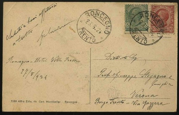 Cartolina in bianco e nero di misure 14,1x9 cm. Condizioni : USATO - Stato : Buono, ordinari segni d'uso e del tempo. Altre note : Viaggiata con francobollo e timbro di annullo di Roncegno.