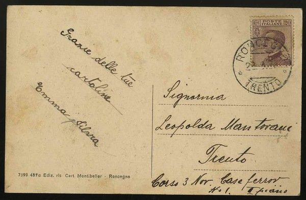 Cartolina in bianco e nero di misure 14x9 cm. Condizioni : USATO - Stato : Buono, ordinari segni d'uso e del tempo. Altre note : Viaggiata con francobollo e timbro di annullo di Roncegno.