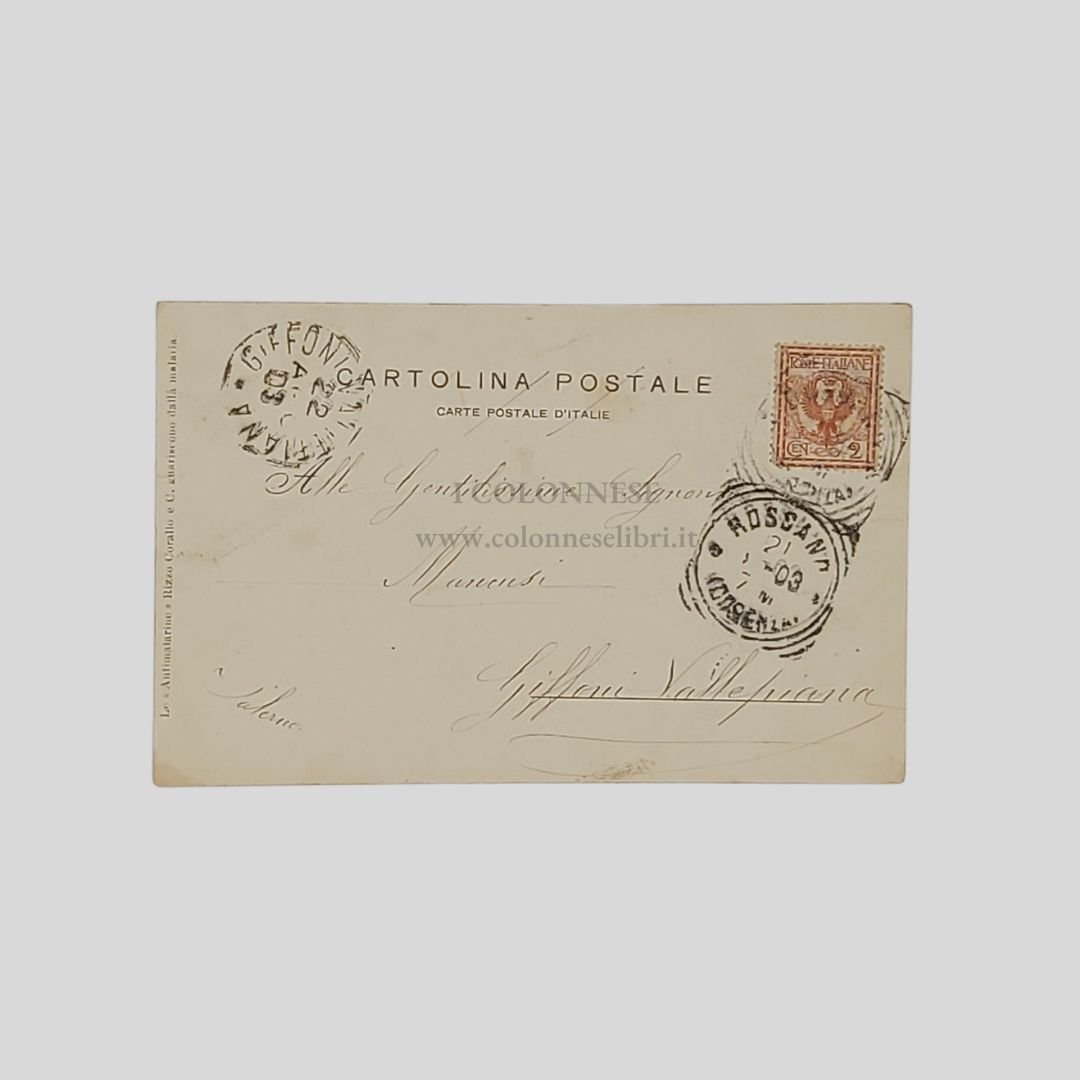 Cartolina fotografica originale, undivided back (1900). Viaggiata, cm 9×14 ca. Francobollo e timbri (21/8/1903). Tracce d’uso, alone all’angolo inferiore. Invio al recto. Cartolina riportante al verso la dicitura«Le antimalarine Rizzo Corallo & C. guariscono dalla malaria».