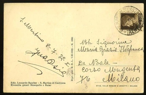 Cartolina in bianco e nero di misure 14x9 cm. Condizioni : USATO - Stato : Buono, ordinari segni d'uso e del tempo. Altre note : Viaggiata con francobollo e timbro di annullo di San Martino di Castrozza.
