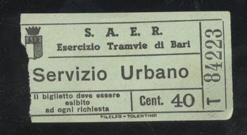 SAER Esercizio Tramvie di Bari Biglietto Tram Servizio Urbano cent 40 Anni '50
