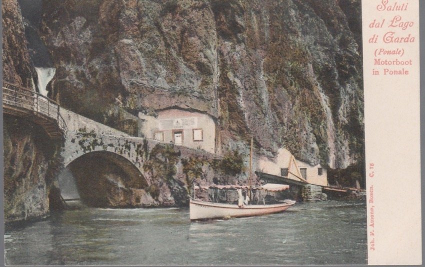 Saluti dal Lago di Garda. (Ponale). Motorboot in Ponale.