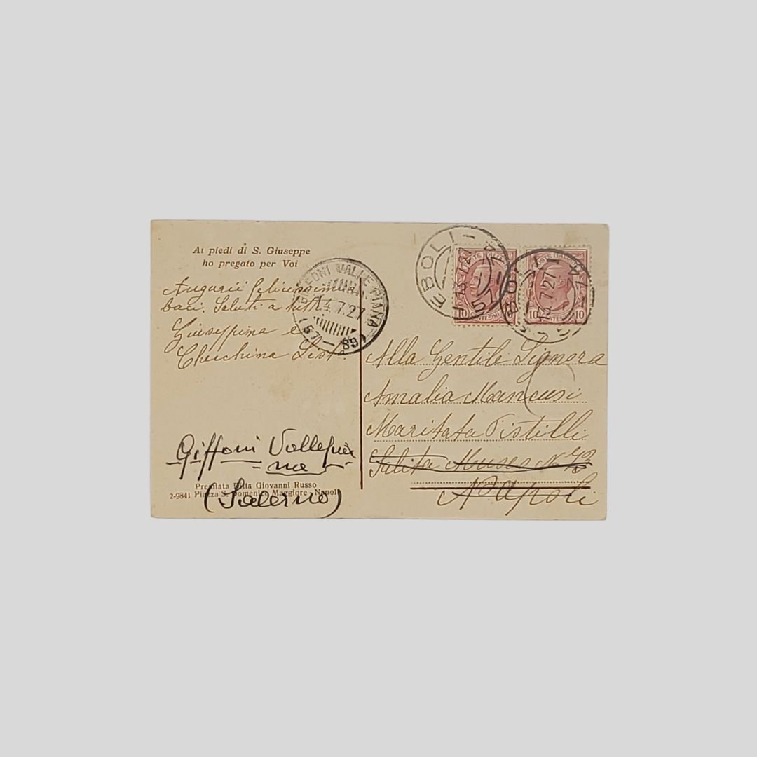cm 9x14. Cartolina d’epoca. Viaggiata. Francobolli, timbri (14/7/1927). Tracce d’uso, alcuni aloni al recto. Non comune.