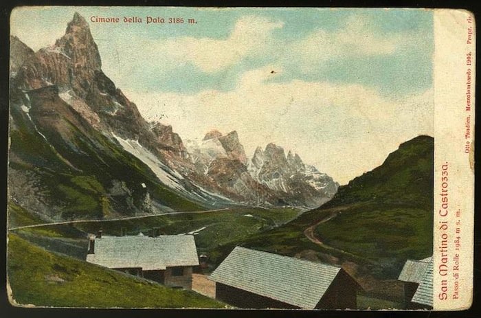 Cartolina a colori di misure 9,1x14,3 cm. Condizioni : USATO - Stato : Buono, ordinari segni d'uso e del tempo. Altre note : Viaggiata con timbro e francobollo. Presenta sul fronte l'indicazione della montagna di Cimone della Pala 3186 m.
