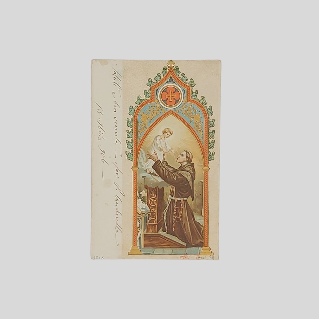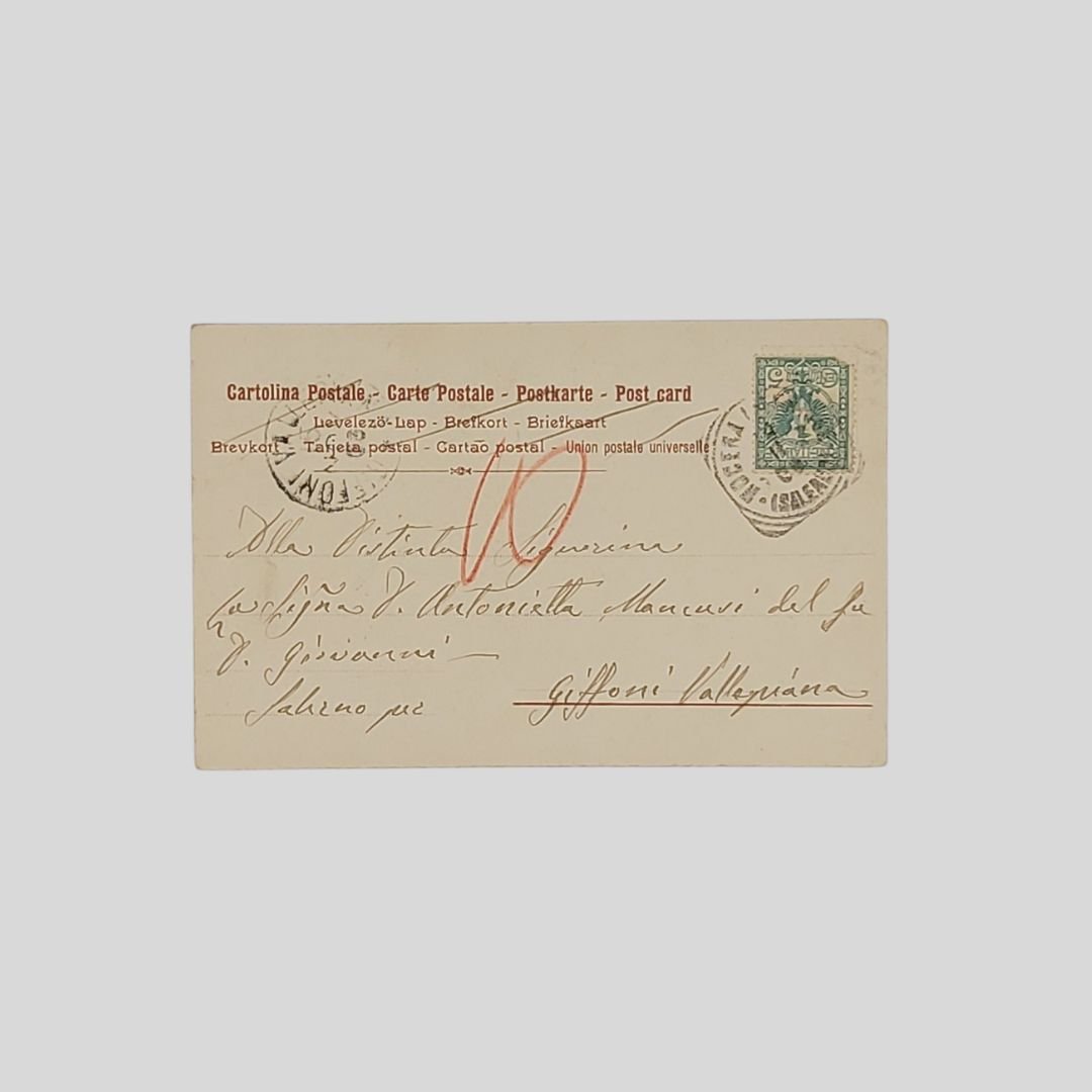 cm 14×9. Undivided back. Cartolina d’epoca in cromolitografia. Viaggiata, datata 13 novembre 1906. Francobollo, timbri. Tracce d’uso. Invio al recto. Rara.<BR>