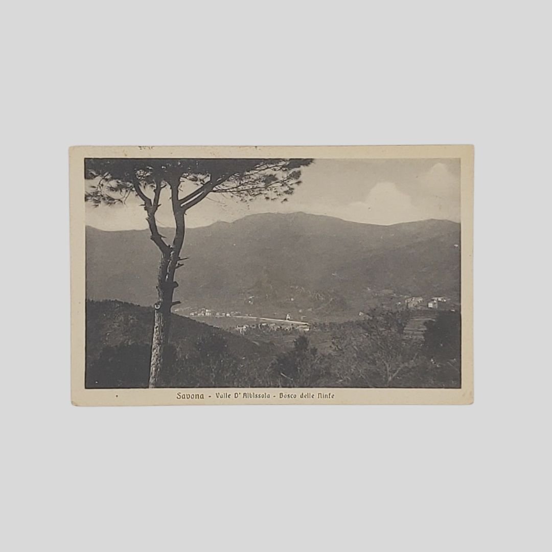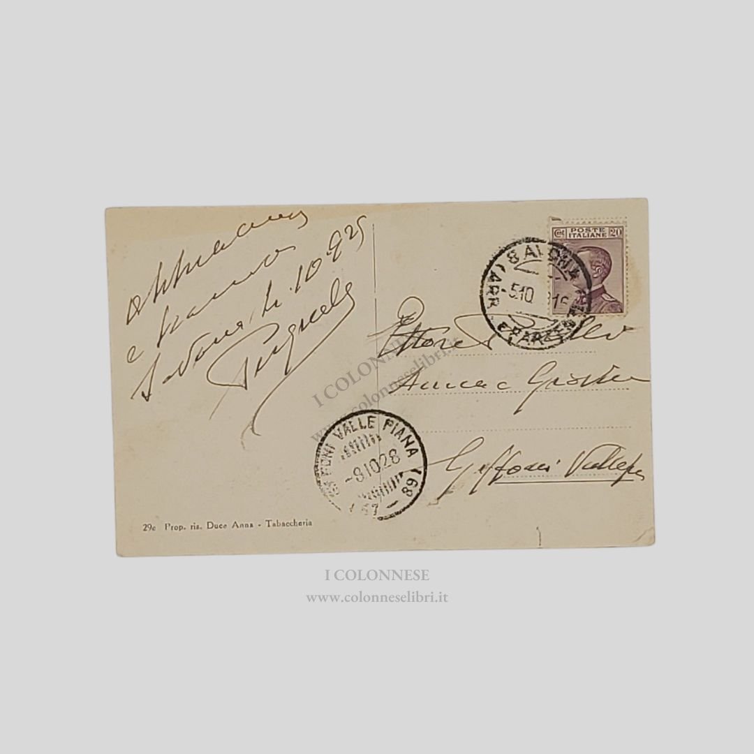 Cartolina fotografica originale viaggiata, cm 14×9, timbri e francobollo, 4/10/1925. Lieve traccia d’uso all’angolo inferiore.