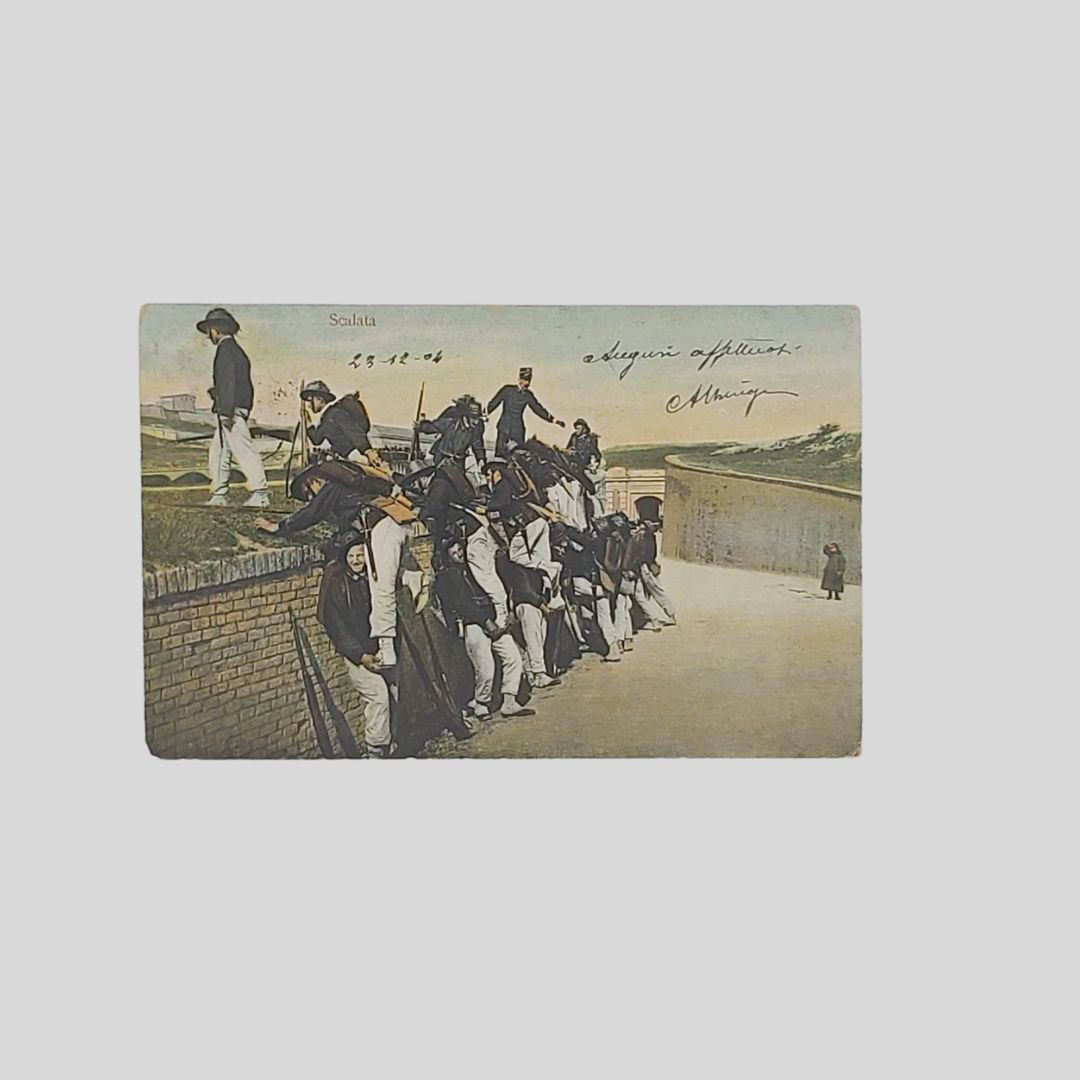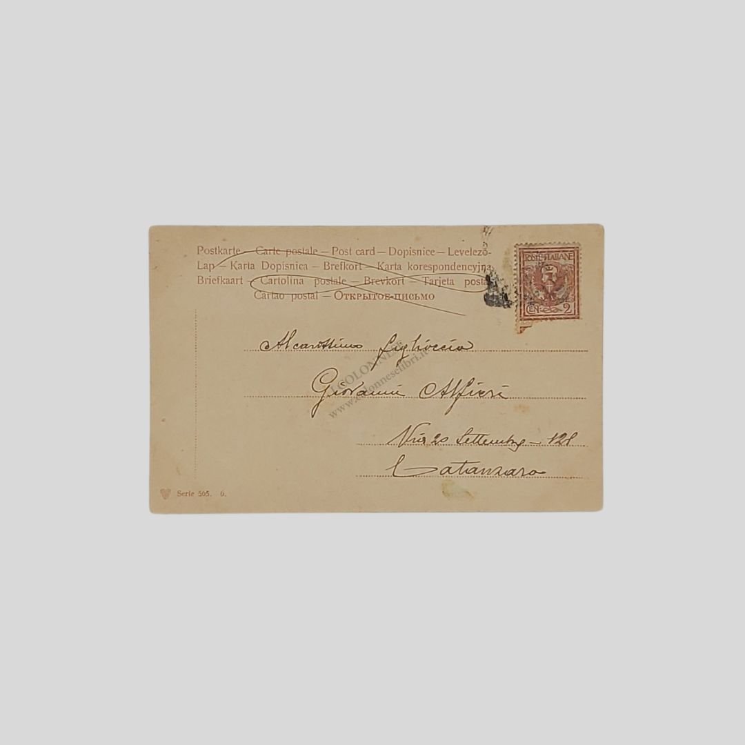 Undivided back. Cartolina d’epoca in fotocromolitografia. Viaggiata, 23/12/1904, cm 14×9. Francobollo, timbro. Tracce d’uso agli angoli.