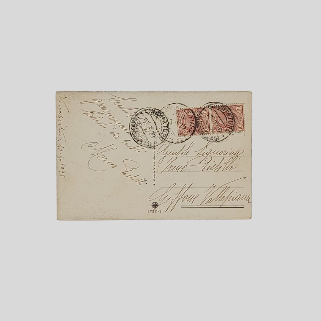 Cartolina d’epoca. Viaggiata, invio del 10/9/1925, cm 9×14. Francobolli, timbri. Tracce d’uso agli angoli.