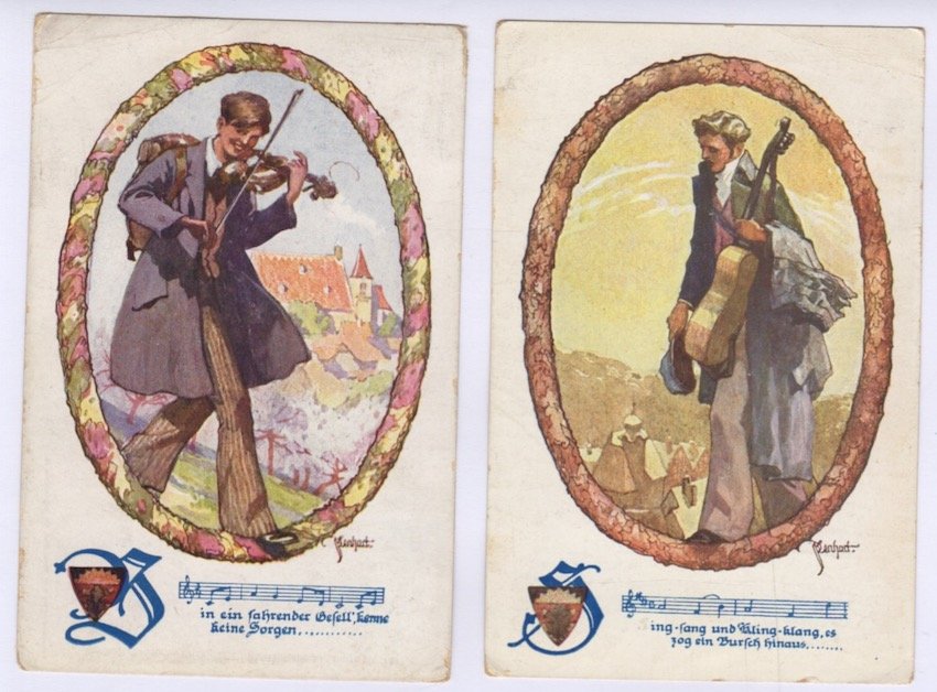 Serie di 2 cartoline illustrate: Violinisti.