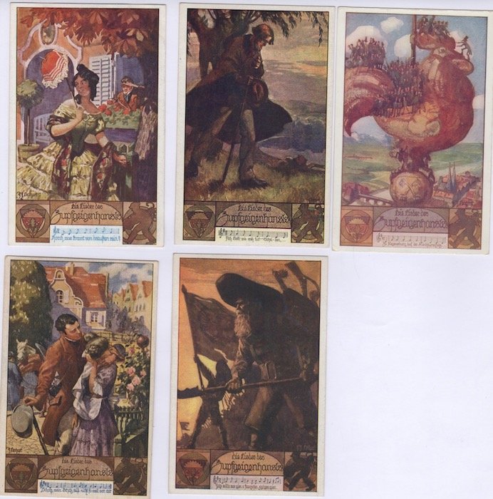 Serie di 5 cartoline illustrate: Zupfgeigenhansls.
