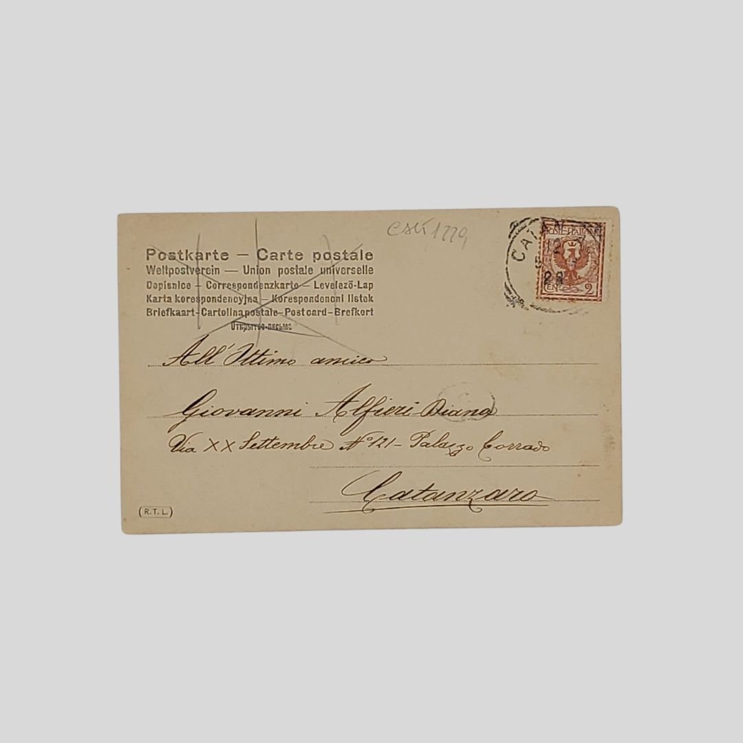 Undivided back, cm 14×9. Viaggiata, francobollo, timbro, postalizzata in Italia il 12/5/1904. Liev. ondulata.