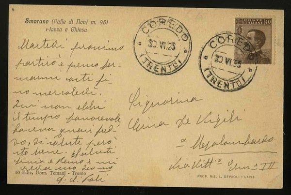 Cartolina in bianco e nero di misure 13,7x8,8 cm. Condizioni : USATO - Stato : Buono, ordinari segni d'uso e del tempo. Altre note : Viaggiata con francobollo e timbro di annullo di Coredo.
