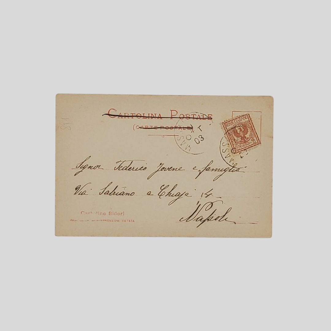 cm 9x14. Fotocartolina originale. Undivided back. Viaggiata, francobollo, doppio timbro (ottobre 1903). Lievemente rifilata al margine inferiore. In buone condizioni.