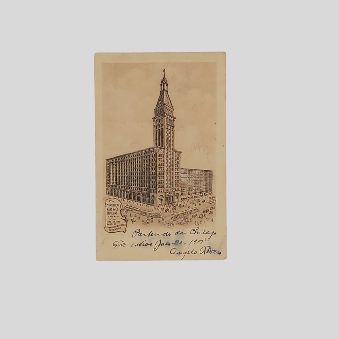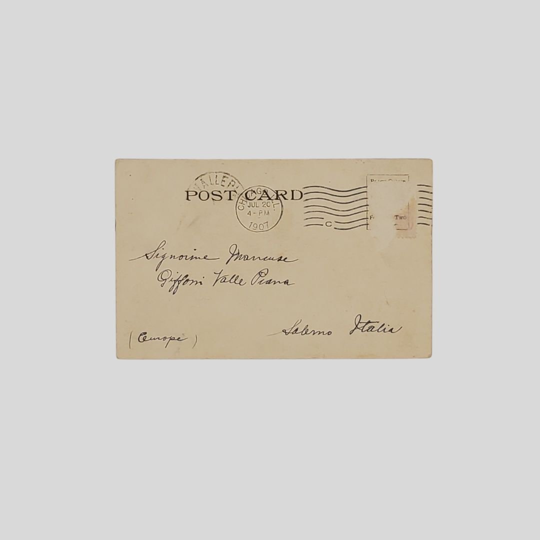 Cartolina d’epoca. Undivided back. Viaggiata, invio del 20/7/1907, cm 14×9. Timbri. Francobollo asportato. Piegatura all’angolo inferiore.