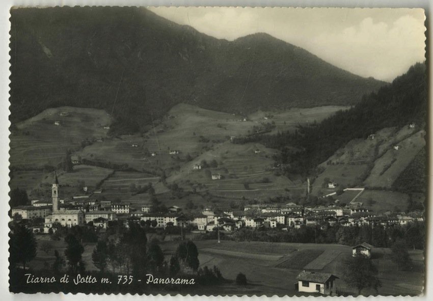 Cartolina postale fotografica alla gelatina di misure 147x104 mm con griglia al verso. Condizioni : USATO - Stato : Buono, ordinari segni d'uso e del tempo. Altre note : Veduta di Tiarno di Sotto. Cartolina viaggiata a Trento con francobollo e timbro dell'ufficio postale di Tiarno. Al verso note manoscritte.