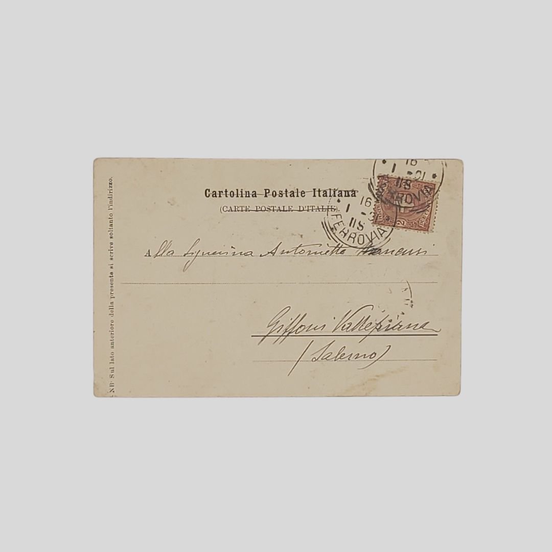 Undivided back, cm 9x14. Cartolina d’epoca. Viaggiata. Francobollo, timbri. Tracce d’uso agli angoli. Rara.