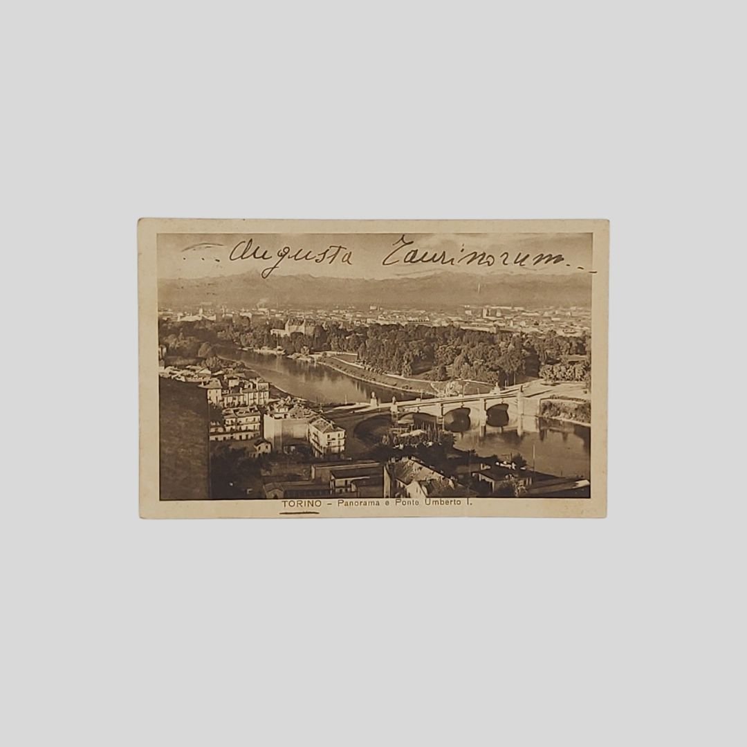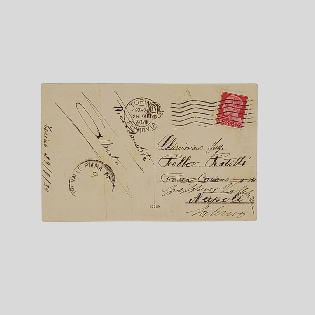 Cartolina d’epoca virata in seppia. Viaggiata, 29/8/1930, cm 14×9. Francobollo, timbri. Forte piegatura.