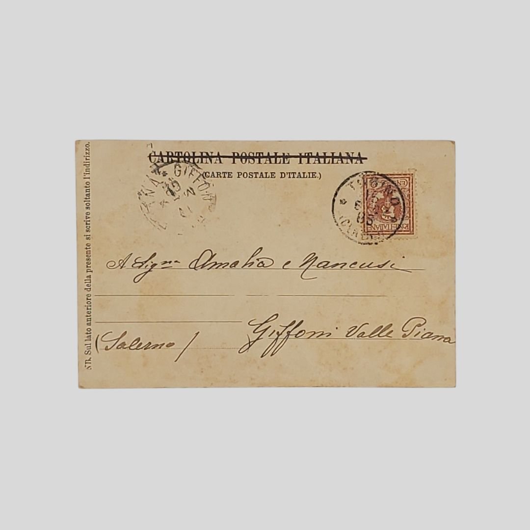 Undivided back, cm 14×9. Cartolina d’epoca. Viaggiata. Francobollo, timbri. Tracce d’uso, piega al margine inferiore sinistro. Animata. Non comune