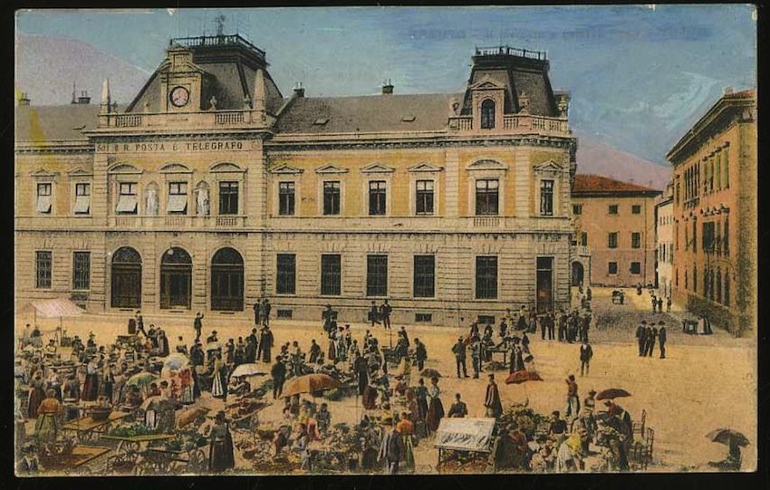 Trento. Il mercato e palazzo Poste e Telegrafi.
