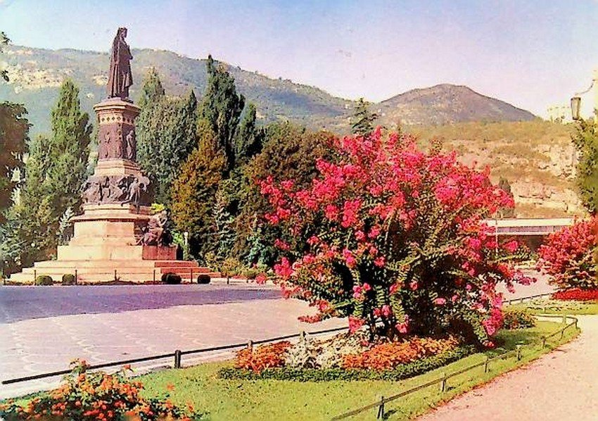 Trento, piazza Dante col Monumento, stazione ferroviaria ed il Monumento a Cesare Battisti sul Doss Trento.