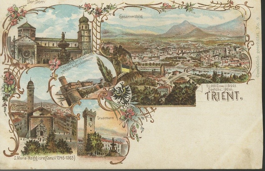 Trient - Der Dom - Gesammtbild - Residenztier Fürstbischöfe mitdem Augustusthurm - Stradrrhurm - S. Maria Maggiore.