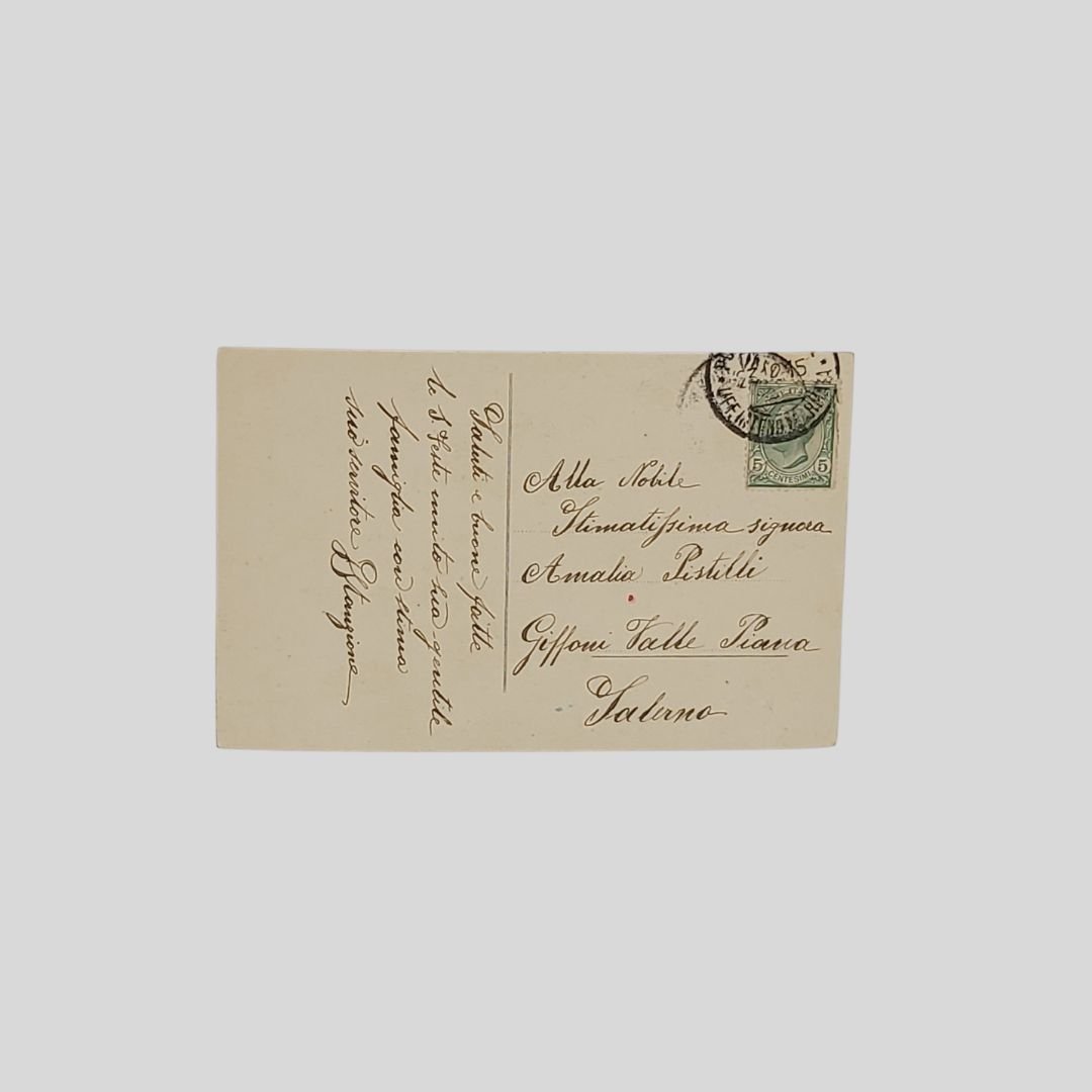 Cartolina fotografica d’epoca. Viaggiata, cm 13,5×8,5. Francobollo, timbro (23/12/1915). Lievemente ondulata ma in buone condizioni.