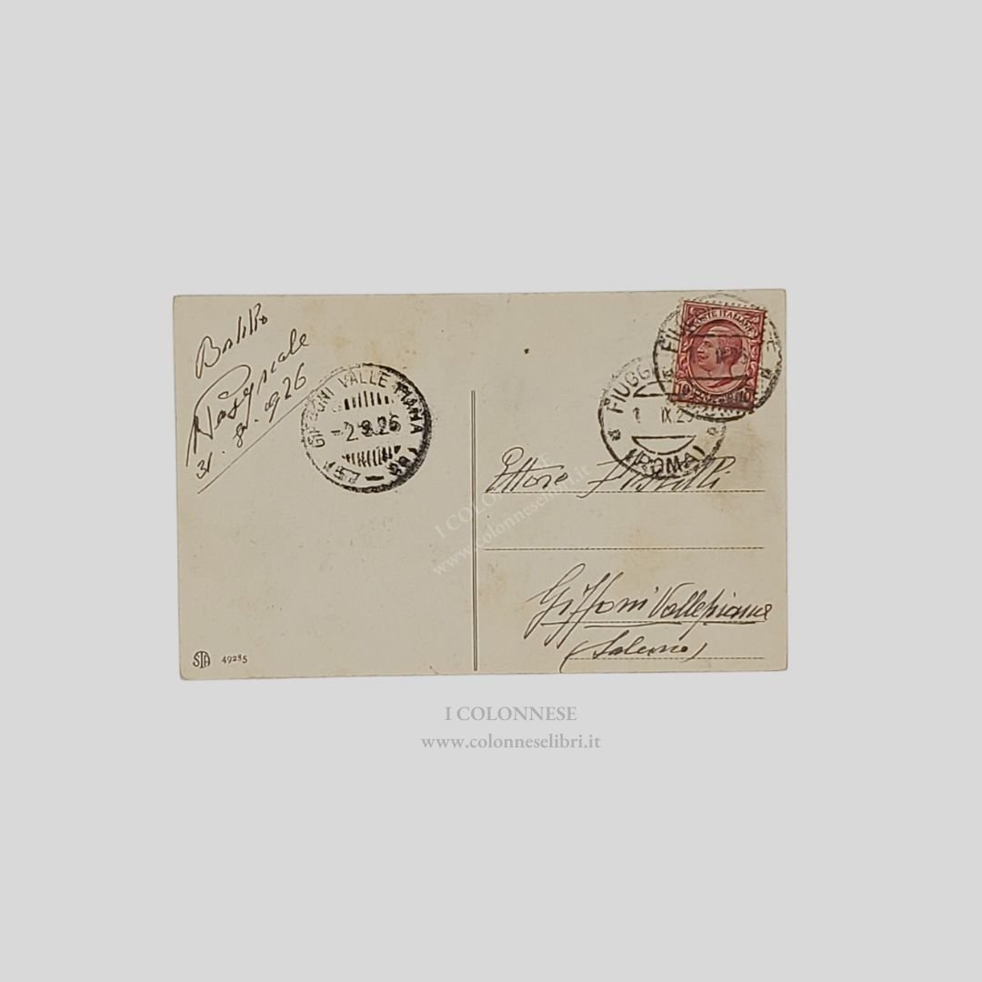 Cartolina fotografica originale. Viaggiata, 31/8/1926, cm 13,5×8,5. Francobollo, timbri. Alone del timbro al recto. Tracce d’uso agli angoli.