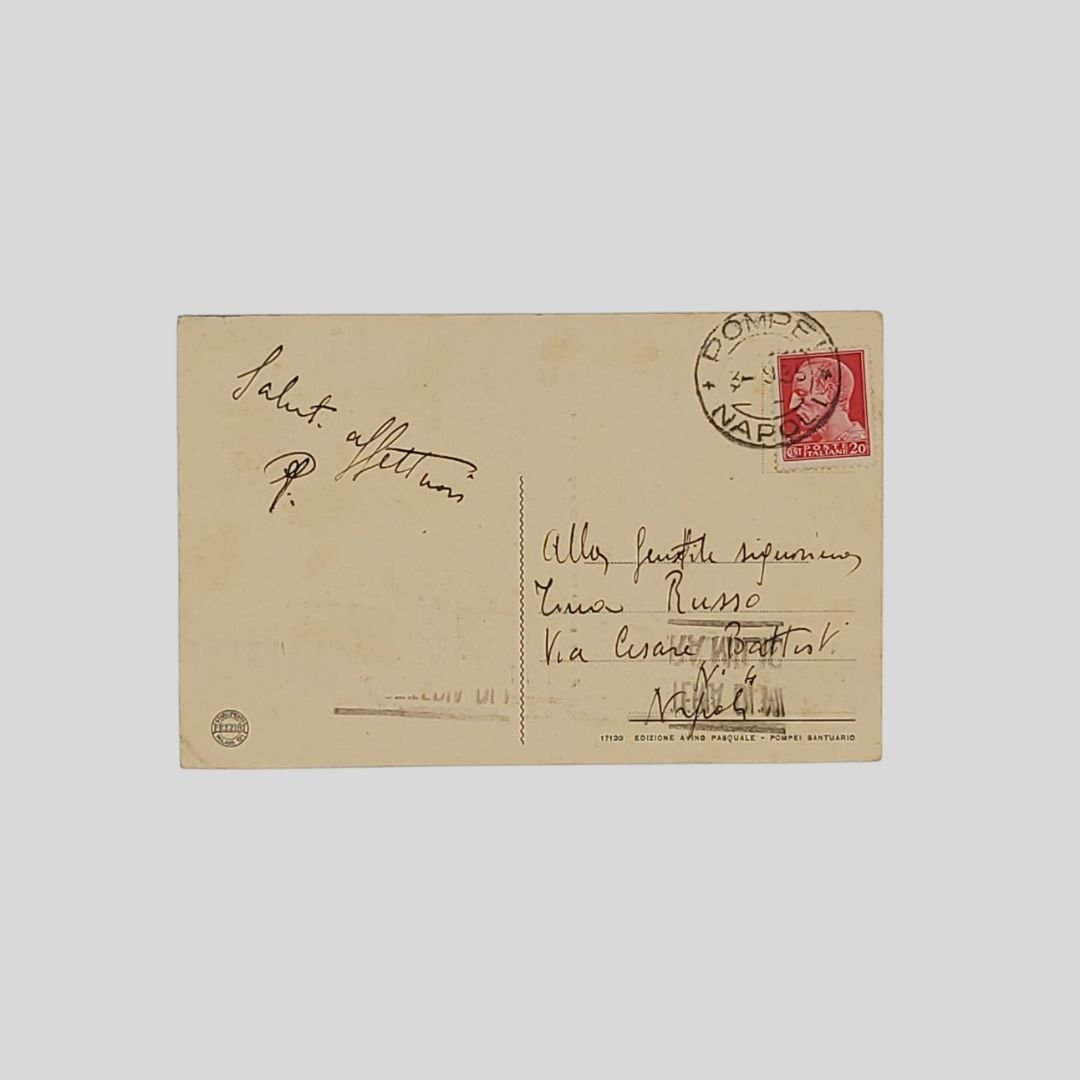 cm 9×14. Cartolina d’epoca. Francobollo, timbro (3/9/1935). Impronta del timbro al recto. Piccola piegatura all’angolo inferiore.