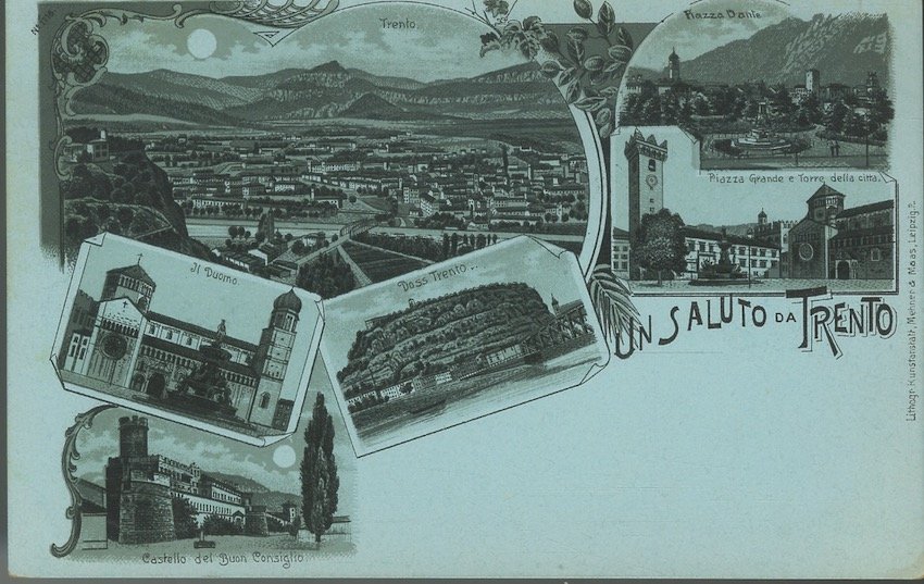 Un saluto da Trento - Castello del Buonconsiglio - Il Duomo - Doss Trento - Trento - Piazza Dante - Piazza Grande e torre della città.