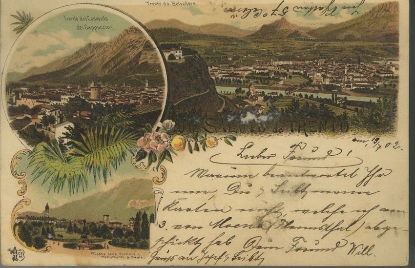Un saluto da Trento dal Convento dei capuccini, da Belvedere - Piazza della stazione e monumento a Dante.