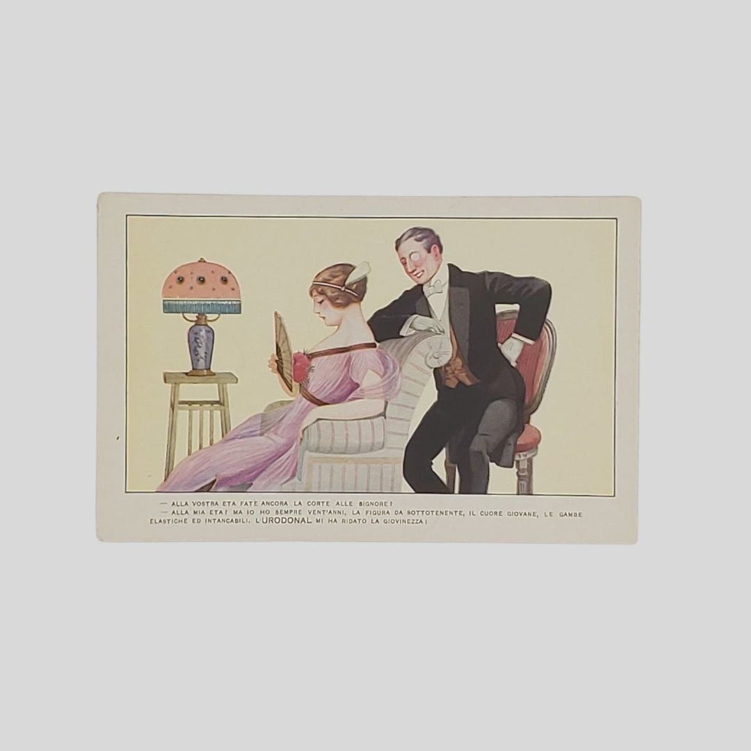 Cartolina pubblicitaria d’epoca. Non viaggiata, s.d. (anni ’20), cm 14×9. Bella cartolina in stile Art déco. In buone condizioni. «Alla vostra età fate ancora la corte alle signore! Alla mia età! Ma io ho sempre vent’anni, la figura da sottotenente, il cuore giovane, le gambe elastiche ed intancabil. L’Urodonal mi ha ridato la giovinezza!» L’Urodonal fu brevettato dal dottor J.-L. Chatelain, farmacista di 1a classe (ex Capo di Laboratorio ed ex Interno degli Ospedali di Parigi). Era un rimedio per sciogliere l’acido urico, utilizzato nel trattamento dell’artritismo, reumatismo, arteriosclerosi, obesità, litiasi renale e biliare, gotta, renella, dolori pituiti, acidità.