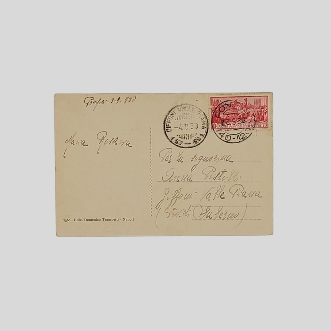 cm 14×9. Cartolina d’epoca. Viaggiata, 3/9/1930. Francobollo, timbri. Tracce d’uso.