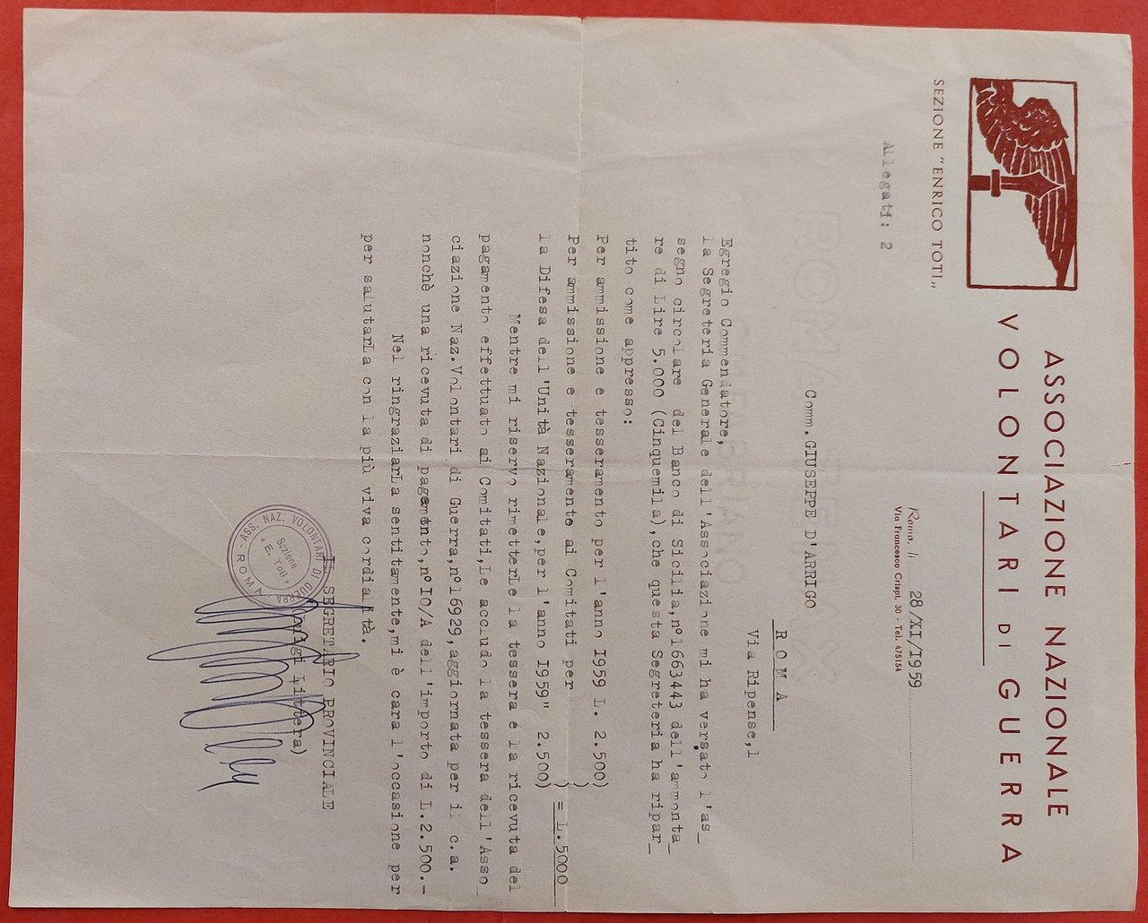 Tre documenti in 8°, spediti in diverse date dall'Associazione Nazionale Volontari di Guerra (A.N.V.G) a Giuseppe D'Arrigo. Primo documento (27 novembre 1959) è una lettera personale dal Segretario Generale dell' A.N.V.G. Augusto Pescosolido a Giuseppe D'Arrigo (Commendatore ragioniere della stessa associazione). Il secondo documento (28 novembre 1959) è una lettera riguardo l'aggiornamento della tessera di Giuseppe D'arrigo da parte di Luigi Littera (Segretario Provinciale). Il terzo documento (12 aprile 1962) è una raccomandata per la riunione dei Direttivi Nazionali dell'A.N.V.G. che chiama i membri a partecipare. Il primo documento resenta uno strappo sul lato alto.