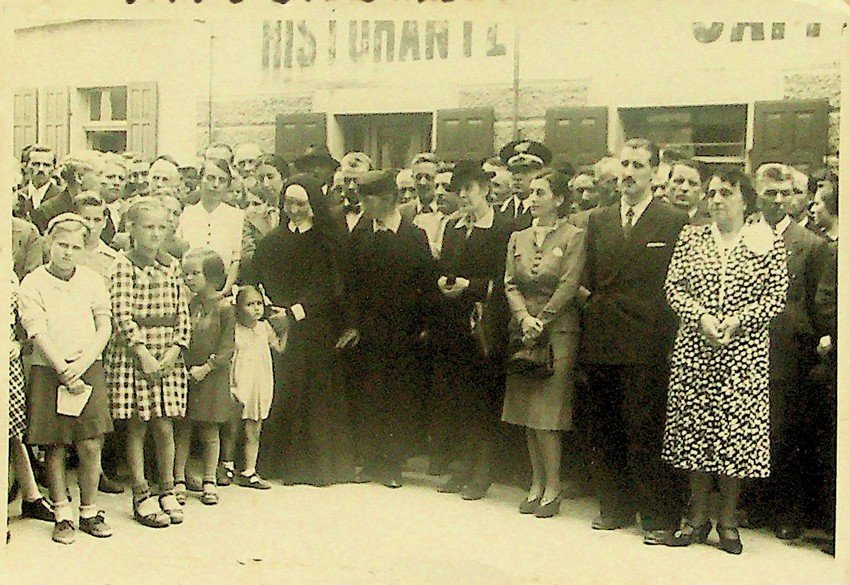 Veduta di varie autorità e bambini davanti ad un ristorante - caffè.