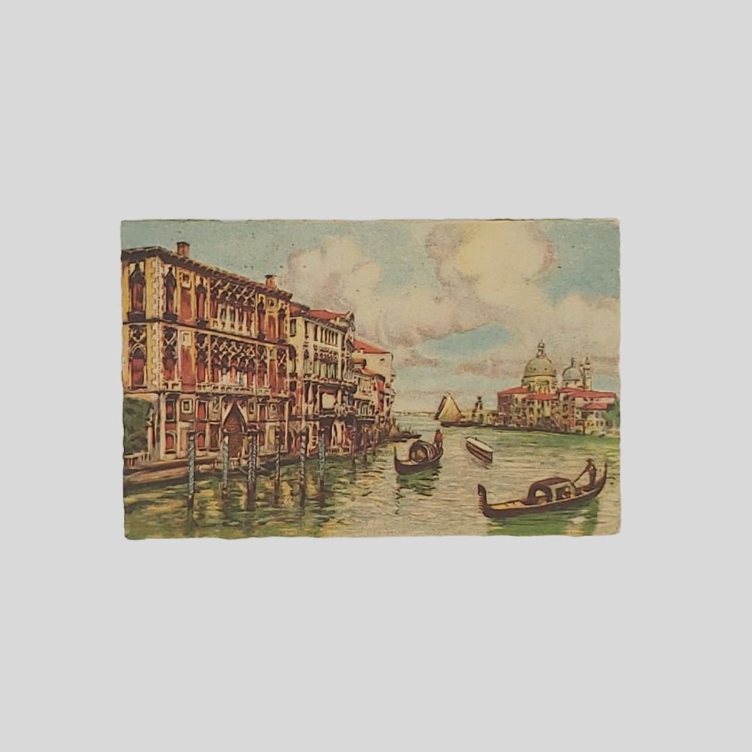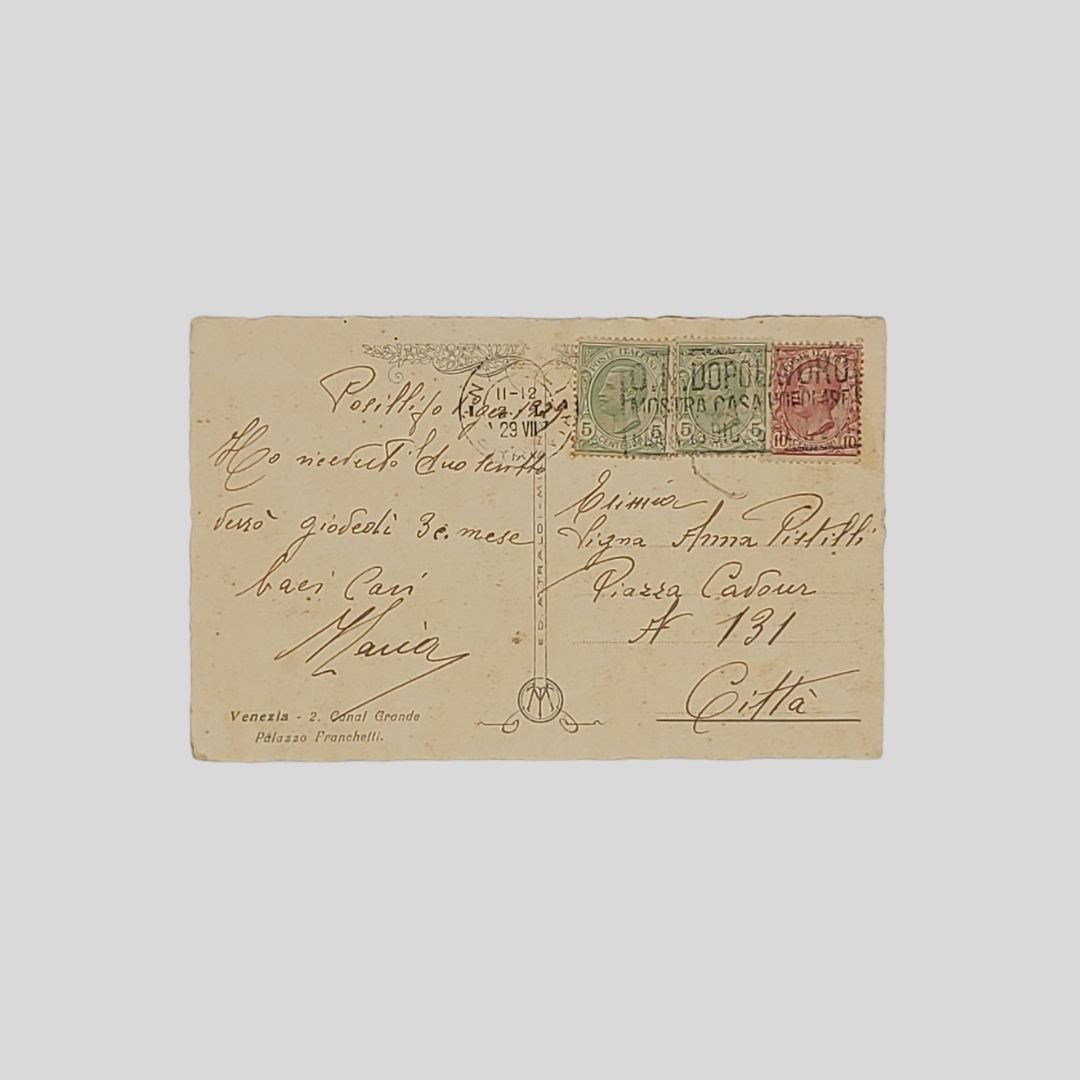 cm 14×9. Cartolina pittorica d’epoca, con bordi ondoluti. Viaggiata, invio del 1° Gennaio 1929. Timbro, francobolli con annullo propagandistico «O.N. Dopolavoro Mostra Casa Popolare». In buone condizioni.