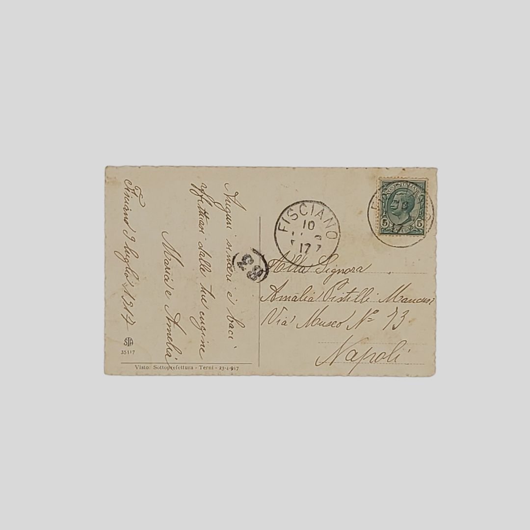 cm 8,5×13,5. Cartolina d’epoca, con bordi ondulati. Viaggiata. Timbri, Francobollo. Lievi tracce d’uso.