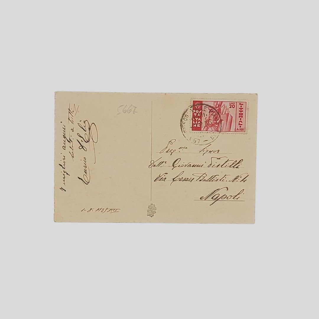 Cartolina d’epoca con bordi ondulati. Piacenza, Ditta Garioni. Viaggiata, invio del 1/8/1939. cm 14×9. Francobollo, timbro. In ottime condizioni.