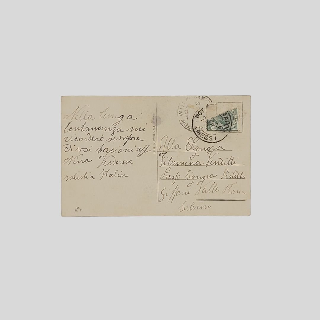 Cartolina d’epoca. Viaggiata, invio del 18/7/1927, cm 9×14. Francobollo parzialmente staccato, timbri. Tracce d’uso agli angoli.