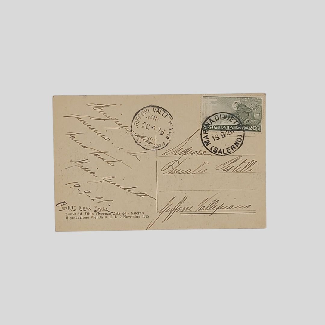 cm 14×9. Cartolina d’epoca. Francobollo, timbri. In buone condizioni.