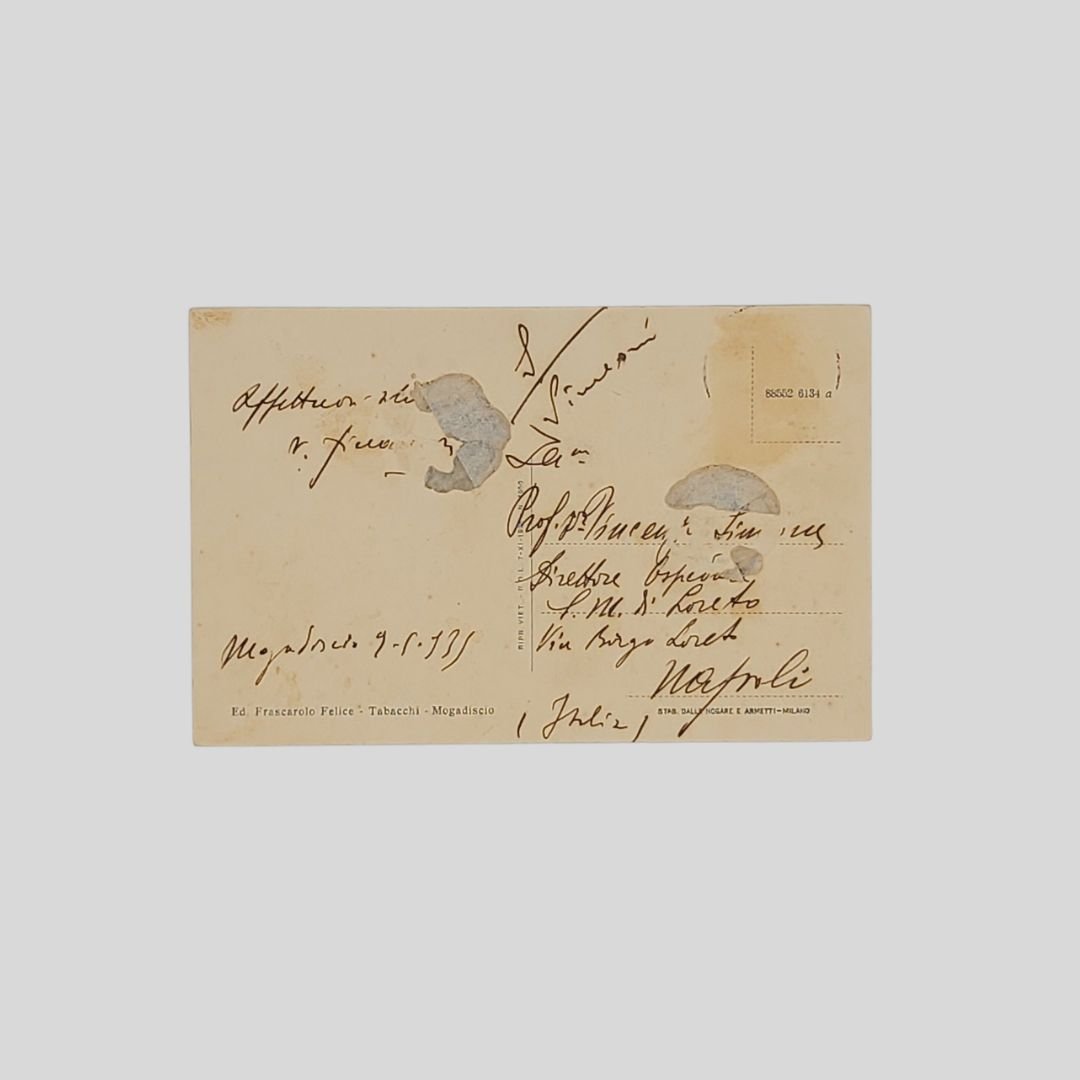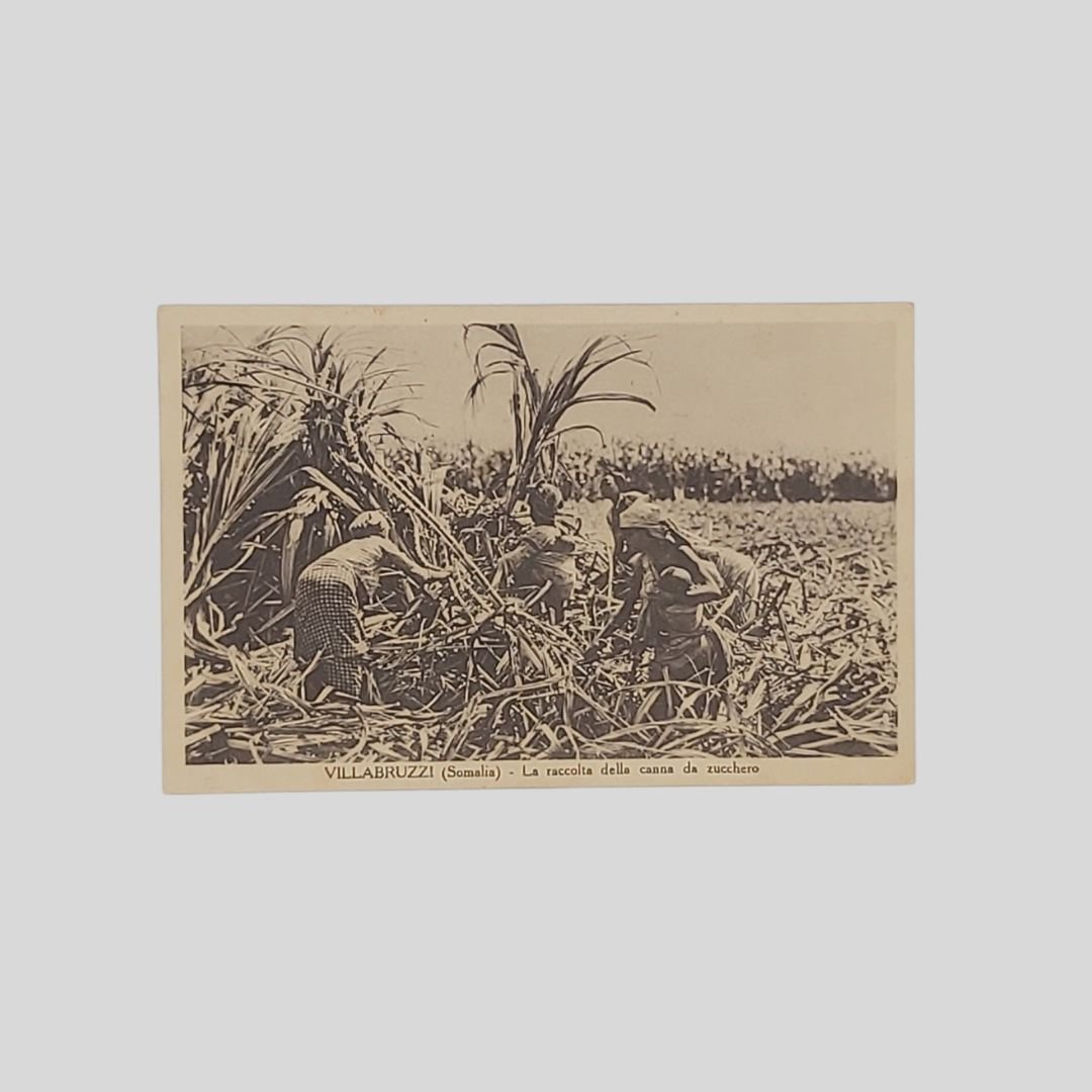 cm 14×9. Cartolina fotografica d’epoca. Viaggiata. Timbro, francobollo asportato. Tracce d’uso al verso. Molto rara. Villabruzzi era la comune dizione della colonia agricola «Villaggio Duca degli Abruzzi» alla periferia del piccolo villaggio somalo di nome Giohar, nella Somalia italiana, fondata nel 1920 dal duca Luigi Amedeo di Savoia-Aosta , la cittadina ebbe uno sviluppo notevole negli anni venti. Vi si insediarono successivamente alcune migliaia di coloni italiani nella seconda metà degli anni trenta.<BR><BR>Divenne in pochi anni il centro agricolo principale della Somalia italiana durante il Fascismo, con una modesta industria alimentare collegata. Il duca vi realizzò dal nulla tutte le necessarie strutture sociali, compreso il telefono, il telegrafo, una farmacia, un ufficio postale, spacci vari, scuole, una stazione dei Carabinieri, una dogana. Inoltre nel villaggio furono anche costruite nei primi anni venti una chiesa e una moschea, il bazar e il mercato italiano, un ospedale, un cimitero cattolico e uno musulmano. Infine fu creata la “Sais”, la Società agricola italo-somala, che fu la maggiore ditta a gestione privata della colonia somala.<BR><BR>Il “Villaggio Duca degli Abruzzi” si trovava a soli 50 km a nord di Mogadiscio, in una vallata fertile vicino al fiume Uebi-Scebeli, e fu collegato alla capitale con una ferrovia (ora disattivata): la Ferrovia Mogadiscio-Villabruzzi. Dopo la seconda guerra mondiale i coloni italiani furono costretti ad andarsene e la zona fu lasciata lentamente incoltivata perdendo il suo potenziale agricolo, specialmente dopo l’inizio della guerra civile in Somalia nel 1991.<BR><BR>“Villaggio Abruzzi”, parzialmente spopolato negli anni cinquanta,dicenne un piccolo quartiere di periferia della crescente cittadina di Giohar. Nel 1960, quando il presidente Siad Barre iniziò il processo di decolonizzazione della Somalia appena diventata indipendente, cambiò nome e divenne anch’esso ufficialmente “Giohar”. Ancora oggi vi abitano ancora oltre 200 Italo-somali, discendenti quasi tutti di coloni italiani e madri somale.