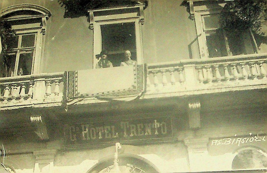 Cartolina postale fotografica di misura 137x89 mm con griglia al verso. Condizioni : USATO - Stato : Buono, ordinari segni d'uso e del tempo. Altre note : Fotografia scattata in occasione dell'arrivo dei Sovrani di casa Savoia a Trento. L'immagine offre il re e la regina sul balcone del Grand Hotel Trento.