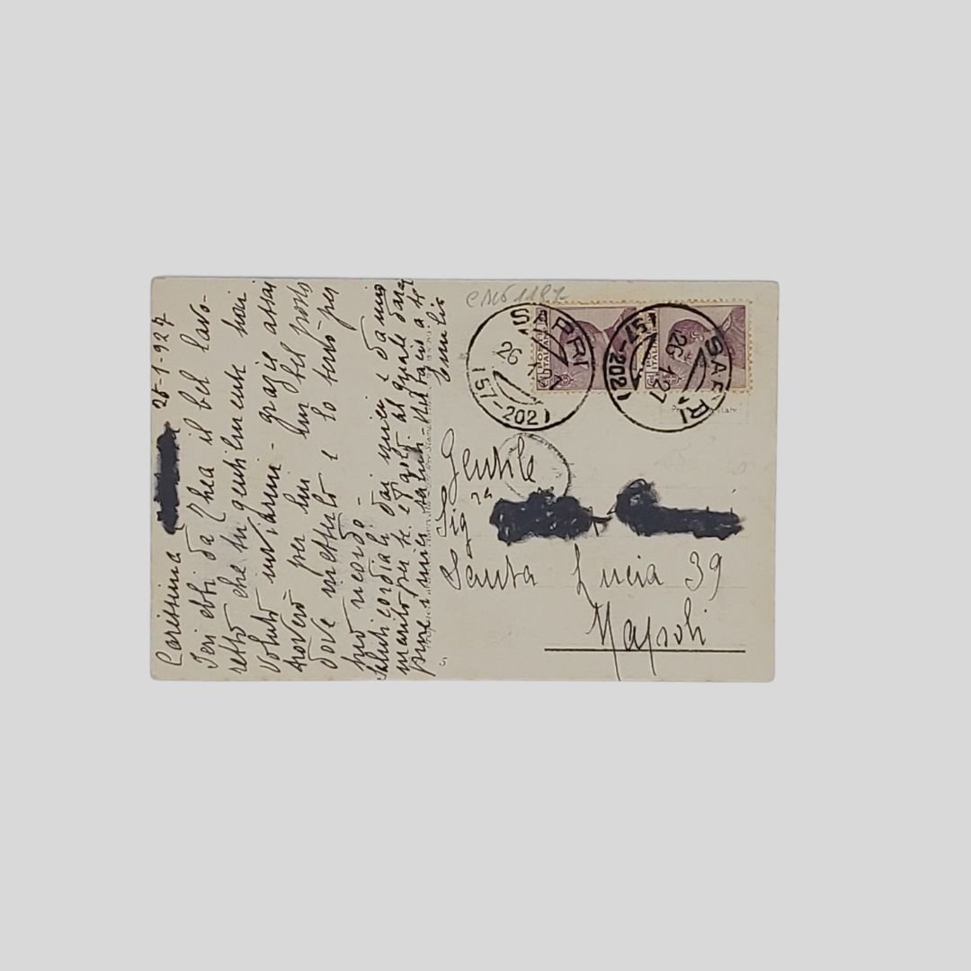 Cartolina d’epoca. Viaggiata, invio del 26/01/1927, cm 8,9×13,7, doppio francobollo, timbri. Tracce d’uso.