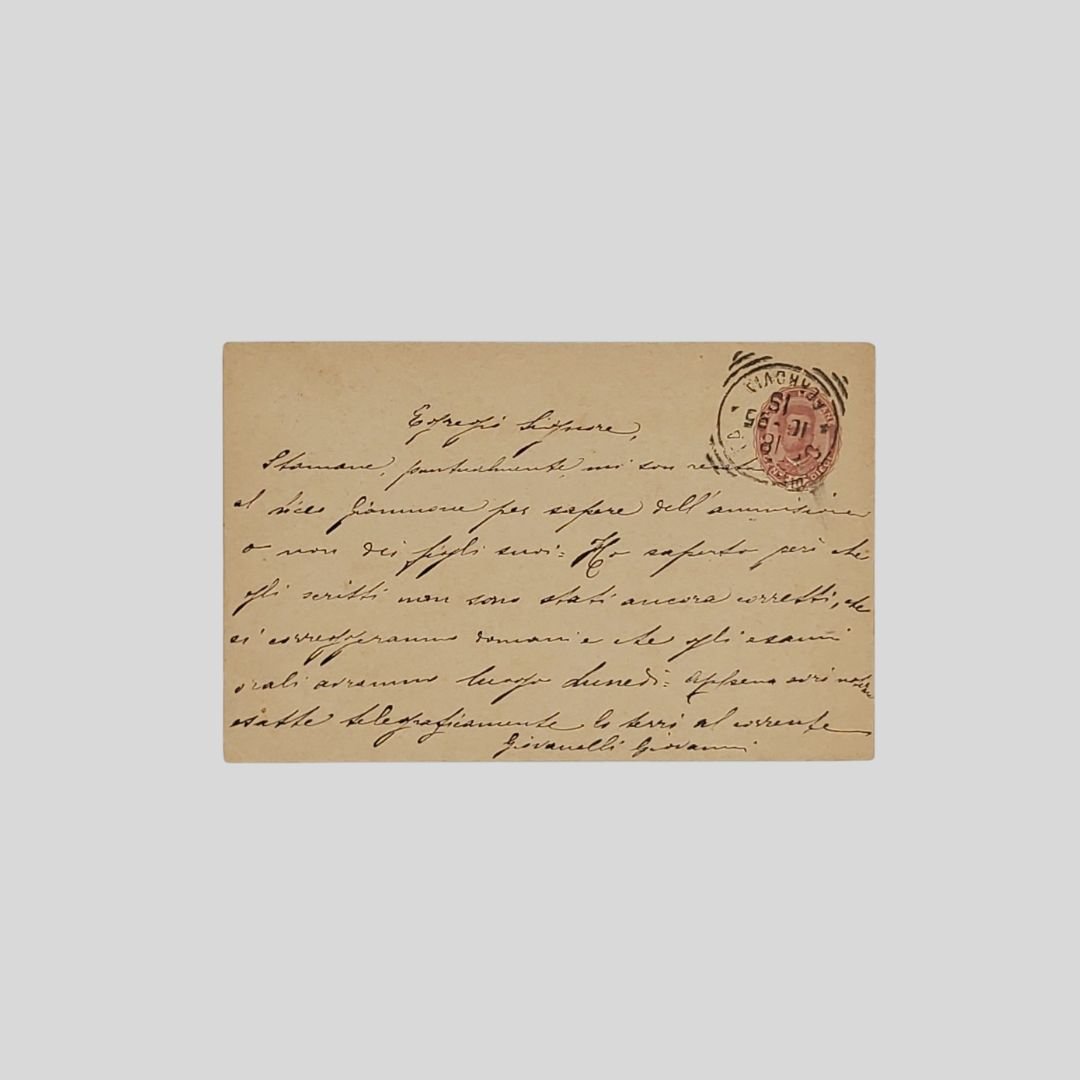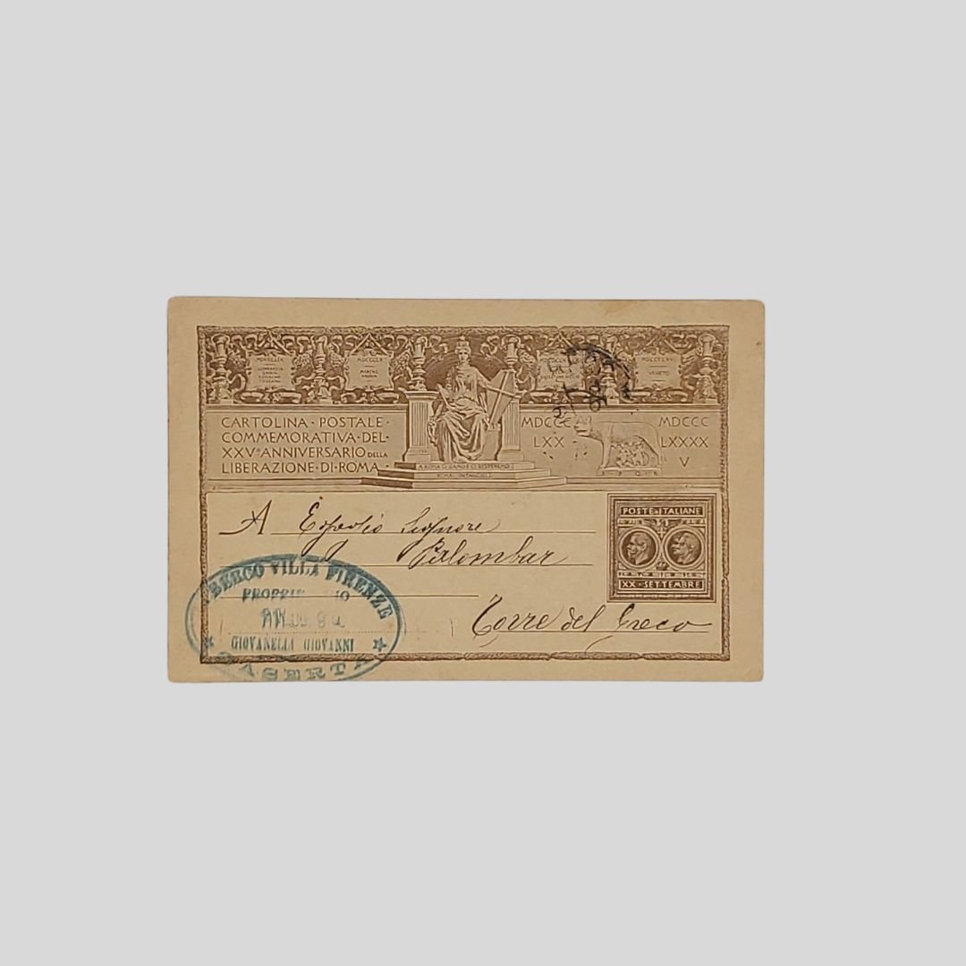 Cartolina commemorativa d’epoca. «Intero postale», 1895. Viaggiata, postalizzata a Caserta con invio a Torre del Greco, il 18.10.1895. In buone condizioni. Non comune. Notizie dell’esito degli esami scolastici al Liceo Giannone di Caserta trasmesse con la cartolina commemorativa del XXV anniversario della liberazione di Roma. Al recto timbro ovale “Albergo Villa Firenze. Proprietario Giovannelli Giovanni. Caserta”. Missiva a firma del proprietario dell’ Albergo Villa Firenze circa gli esami svolti al Liceo Giannone di Caserta: «Egregio Signore, stamane puntualmente mi sono recato al Liceo Giannone per sapere dell’ammissione o non dei figli suoi. Ho saputo però che gli scritti non sono stati ancora corretti, che li correggeranno domani e che gli esami orali avranno luogo lunedì. Appena avrò notizie esatte, telegraficamente la terrò al corrente». L’Intero postale, la cartolina prepagata. Conosciuta più semplicemente come “intero postale”, la cartolina veniva venduta con il francobollo già stampato in alto a destra, questo particolare innovativo fu subito apprezzato perché velocizzava e semplificava la spedizione., un’ idea rivoluzionaria per i tempi, che permetteva a tutti di poter inviare missive brevi, evitando di acquistare il classico foglio di carta, la busta ed il francobollo, sostituiti da un piccolo cartoncino già tassato.