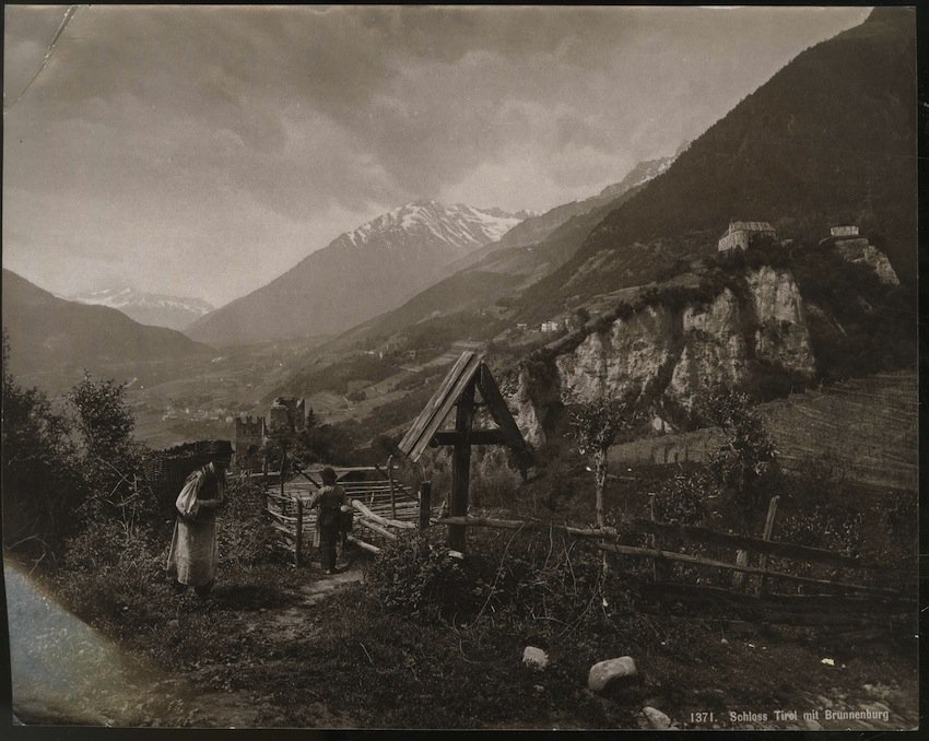 1371. Schloss Tirol mit Brunnenburg. Castel Tirolo con Castel Fontana.