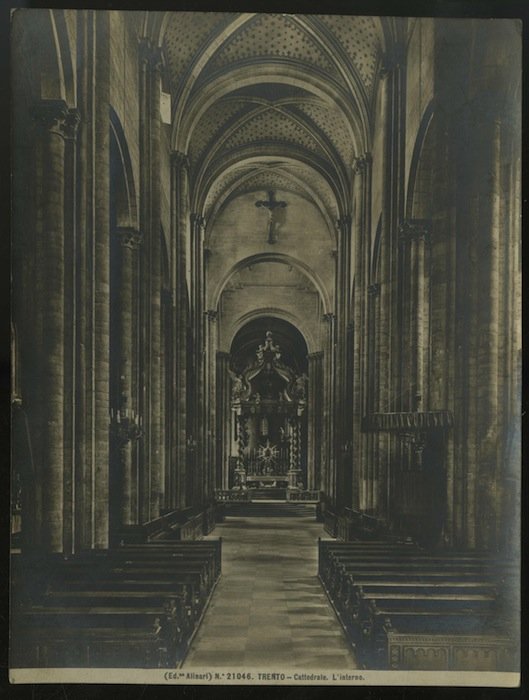 Stampa alla gelatina ai sali d'argento di misure 190x255 mm applicata su cartone. Condizioni : USATO - Stato : Buono, ordinari segni d'uso e del tempo. Altre note : La ditta Alinari nel giugno del 1905 realizzò una campagna fotografica a Trento documentando principalmente il Duomo di Trento e il Castello del Buonconsiglio, ma anche palazzi, portali, dipinti della città e Castel Toblino. Le riprese si situano temporalmente poco dopo la fine dei grandi lavori che rinnovarono il volto di Trento: lo stesso Duomo, che venne restaurato nel 1882/3, mostra ancora fresche le tracce di un così radicale intervento. Ogni fotografia porta, oltre all'intestazione della ditta, il numero di registrazione, il luogo e il soggetto. "Il Popolo", quotidiano di Trento diretto da Cesare Battisti (Trento 1875-1916), sul numero del 20 giugno 1905 informò che ".da quasi un mese si trovano fra noi vari addetti al grande stabilimento fotografico Alinari di Firenze per riprodurre le migliori cose d'arte della nostra città .". Oltre a felicitarsi per l'importante iniziativa sull'altro quotidiano locale, l'"Alto Adige", si accenna ad un fatto non secondario in quel tempo di irredentismo: ".l'intraprendenza della casa Alinari che, non curando spese, sta compiendo opera patriottica ed anche veramente artistica.". Chi abbia consigliato Vittorio Alinari (1859-1932) ad organizzare quella campagna fotografica allora oltre confine ed estesa, successivamente, a Trieste e l'Istria, non è dato sapere con esattezza. È ipotizzabile che qualche irredentista ben radicato nell'ambiente fiorentino, forse lo stesso Battisti, abbia caldeggiato questa spedizione."<br>