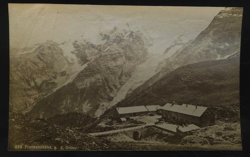 859. Franzenshöhe g. d. Ortler. Rifugio Franzenshöhe visto dall'Ortler.