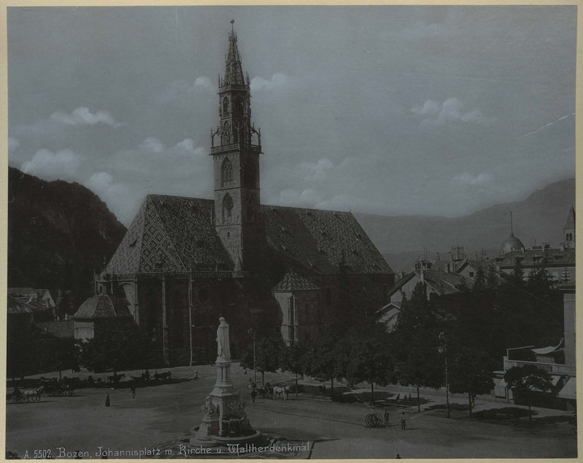 A. 5502. Bozen. Johannisplatz m. Kirche u. Waltherdenkmal. Bolzano. Johannisplatz. Duomo. Monumento a Walther von der Vogelweide.