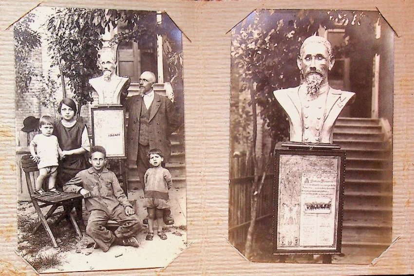 4 stampe alla gelatina ai sali d'argento di misure 87x137 mm applicate su cartoncino a fisarmonica di misure 48x15 cm aperto e 11x15 cm chiuso. Condizioni : USATO - Stato : Buono, ordinari segni d'uso e del tempo. Altre note : Trattasi di un pieghevole in cartoncino contenente 4 vere fotografie, la prima presumibilmente con Battista Butturini e i suoi 4 figli nel giardino antistante la sua casa a Cles mentre poggia la mano sulla scultura del suo mezzo busto, la seconda è un dettaglio del mezzo busto con al piede la dedicatoria in cornice dove è presente un ricco motivo floreale, una fotografia di pattinatori a Cles e le firme degli offerenti. Segue il diploma di brevetto dell'accademia fisico-chimica italiana a Battista Butturini fabbricante di laterizi, dato in Palermo nel 1921. Infine lettera di conferimento del diploma e medaglia d'oro da parte della sezione trentina della precedente accademia per i meriti nella lavatura e lavorazione della creta.
