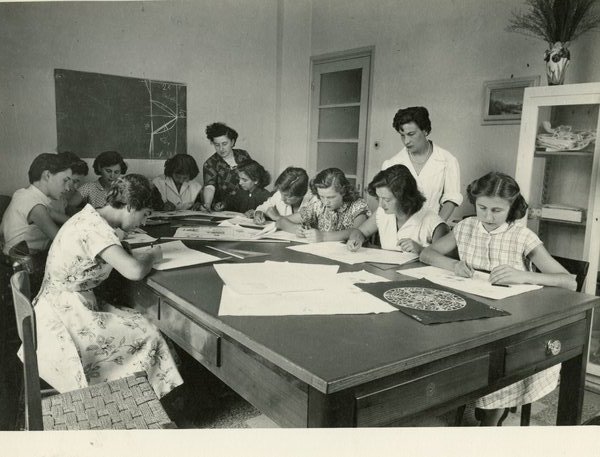 2 foto in ottimo stato di dimensioni 20x25 cm., che raffigurano giovani ragazze intente a ricamare con la supervisione delle insegnanti