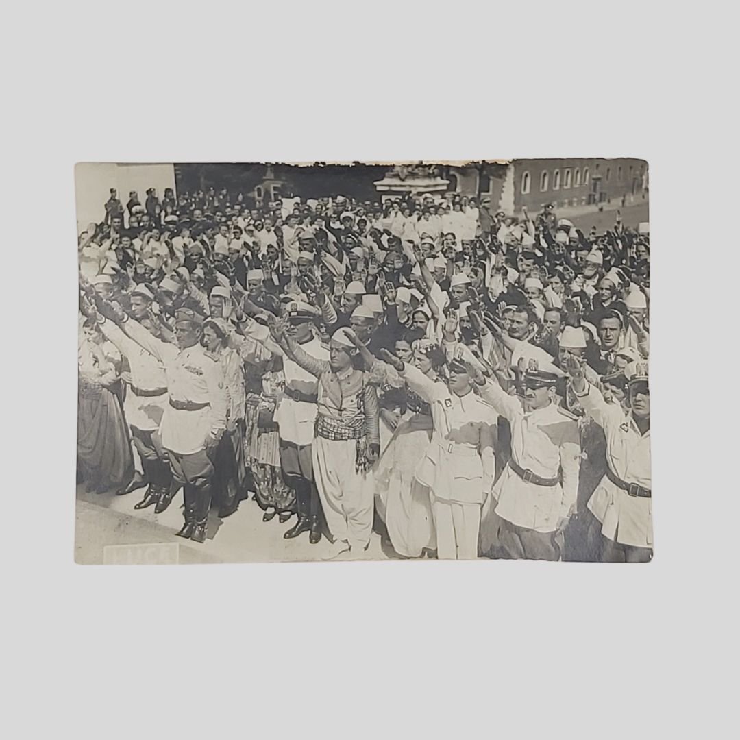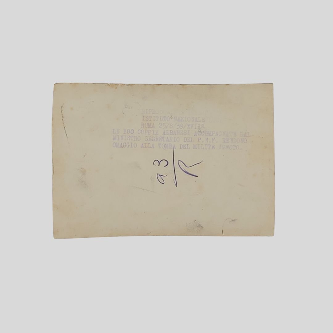 mm 162×116. Fotografia originale. Tracce d’uso ai margini. Al verso è presente didascalia: «Roma, 25.8.39. Le 100 coppie albanesi accompagnate dal Ministro Segretario del P.N.F. rendono omaggio alla tomba del milite ignoto». Non comune.<BR><BR>Cento coppie di sposi albanesi, in costume tradizionale, giunsero a Roma per visitare le colonie marine e montane della Gil che accoglievano i loro figli, la prima tappa fu proprio all’altare della patria in piazza Venezia alla presenza di Achille Starace.